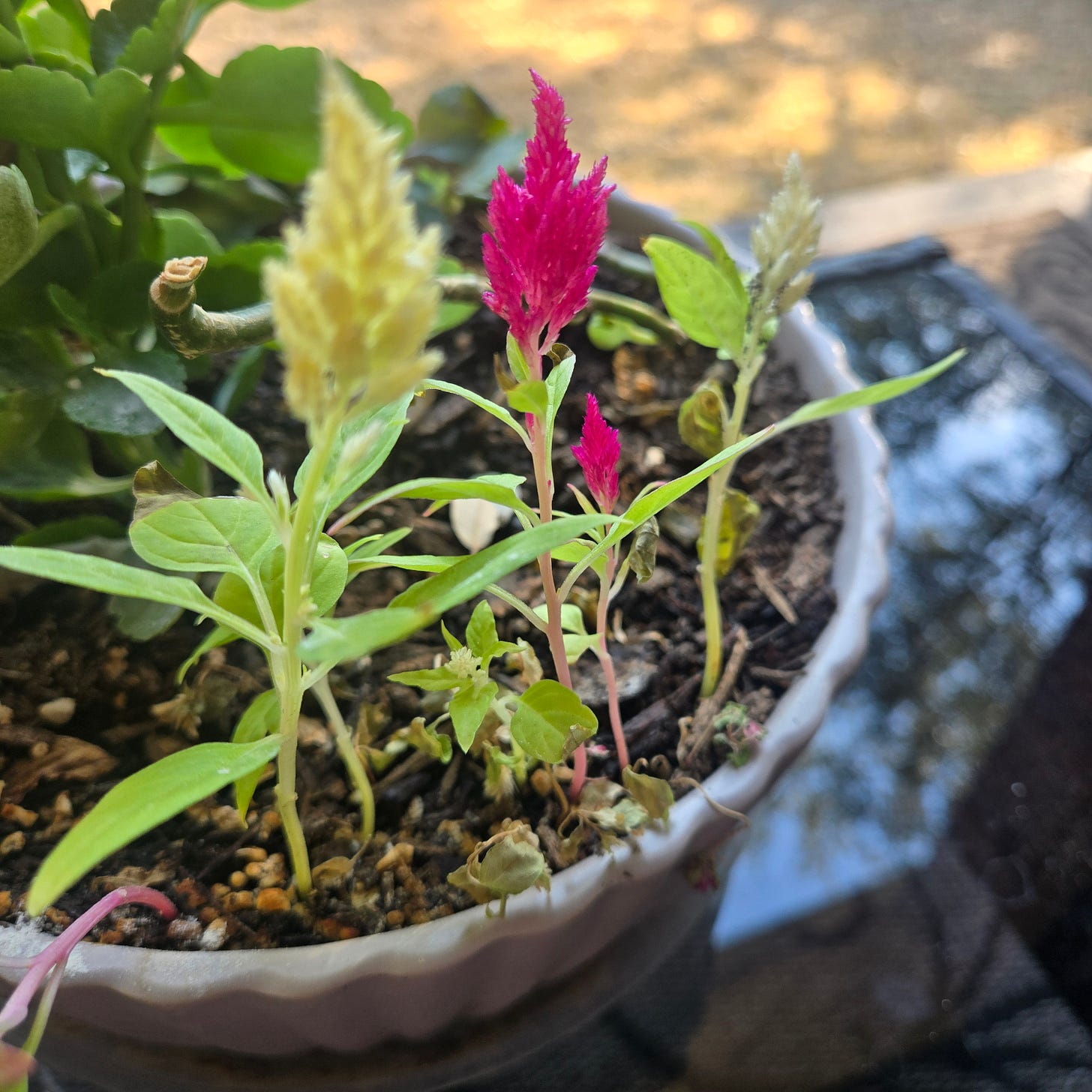 This flowering plant, a Plumed Celosia, was currently growing in my yard, but was not close to this pot.