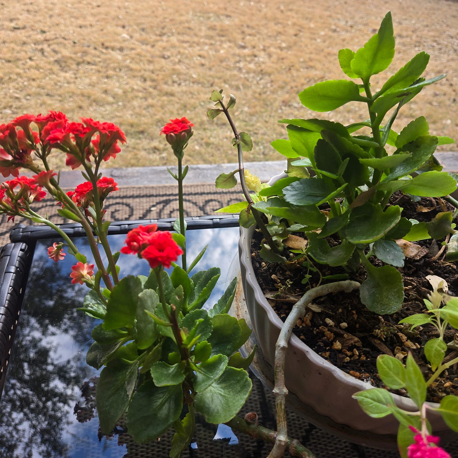 The succulent with tiny red, star shaped flowers, officially called a ‘Florist Kalanchoe’ or ‘Flaming Katy’, came from a broken stem of a ‘parent’ plant my Daddy gave me as a gift years ago.